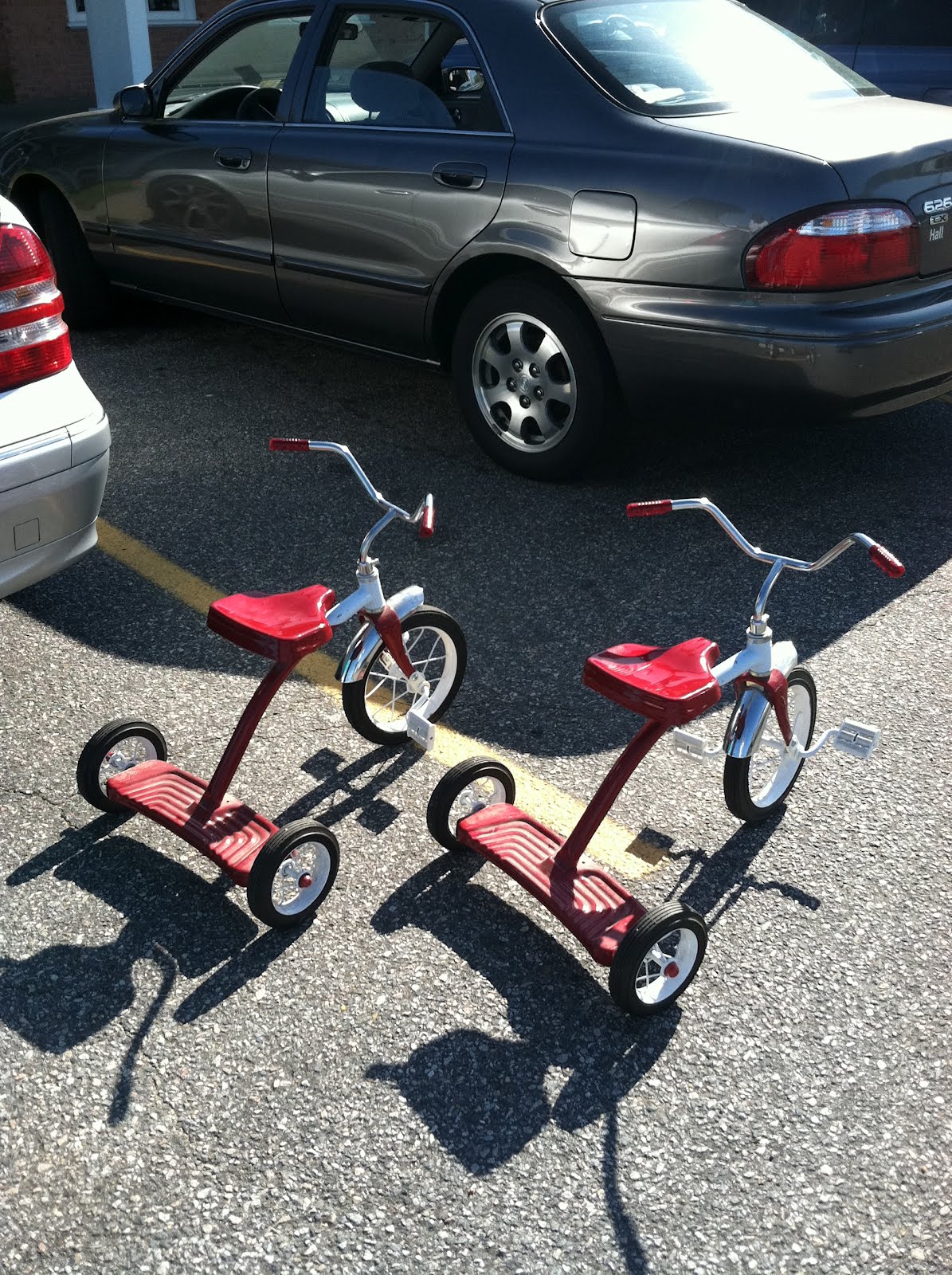 Apparently they had ripped a hole in the screen, climbed out the window, and managed to make it to the ground unscathed (probably 4 to 5 feet down). Daddy rushed outside but they were nowhere to been seen or heard. A minute later he hears "Hi Daddy" and finds them playing in the neighbors Jeep.